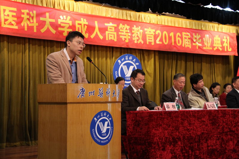 2014级口腔医学专升本班张剑锋同学代表毕业生发言,感谢母校对自己的培养,感恩和同学们相处的三年时光;2014级护理学专升本班班主任邓小茹老师代表兼职班主任发言,鼓励学生奋勇向上,书写更精彩的人生,为母校的校园和历史增添更加绚丽的色彩。