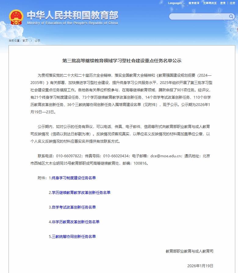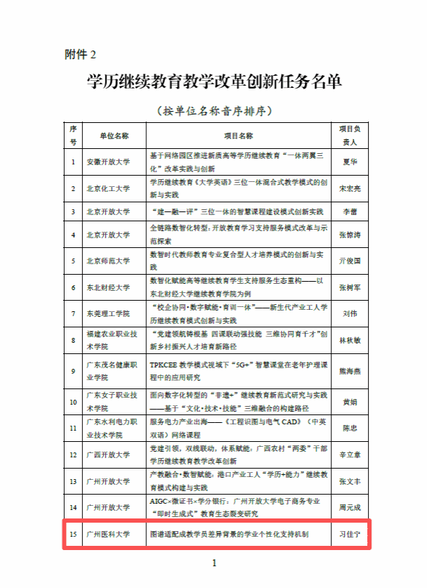 同期,在教育部公示的《第三批高等继续教育领域学习型社会建设重点任务名单》中,我校生物医学工程学院习佳宁副教授负责的《图谱适配成教学员差异背景的学业个性化支持机制》项目,成功入围“学历继续教育教学改革创新任务”培育名单。这是继2024年我校《药学继续教育“五融合五重塑”人才培养模式创新探索与实践》项目(负责人:药学院王玉青副教授)入选第二批重点任务后,在学历继续教育教学改革方面取得的持续进展。