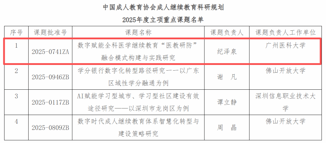 中国成人教育协会近日公布了2025年度成人继续教育科研规划课题立项结果,我校全科医学与继续教育学院院长纪泽泉教授负责的《数字赋能全科医学继续教育“医教研防”融合模式构建与实践研究》课题,成功获批重点A类立项。该课题是本年度全国仅40项重点A类课题之一,体现了我校在继续教育科研创新与实践融合方面的引领性探索。